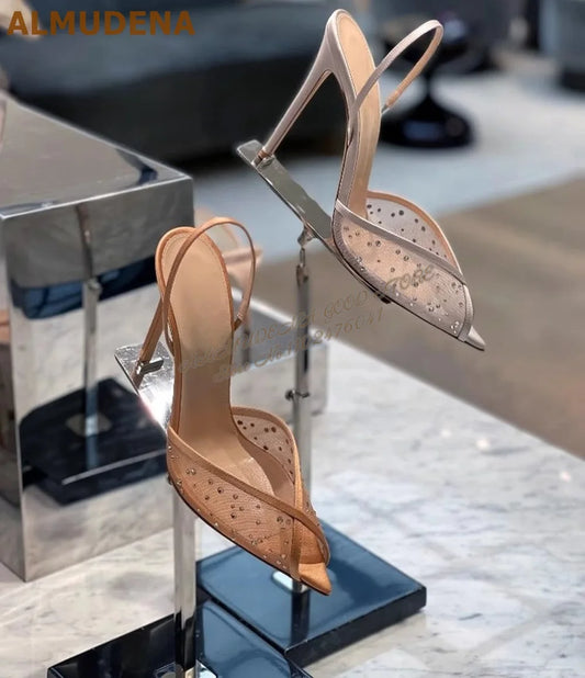ALMUDENA Lace Flowers Mesh Crystal Sandals Stiletto Heel Pointed Toe Bling Bling Rhinestone Slingback Wedding Shoes Floral Pumps
