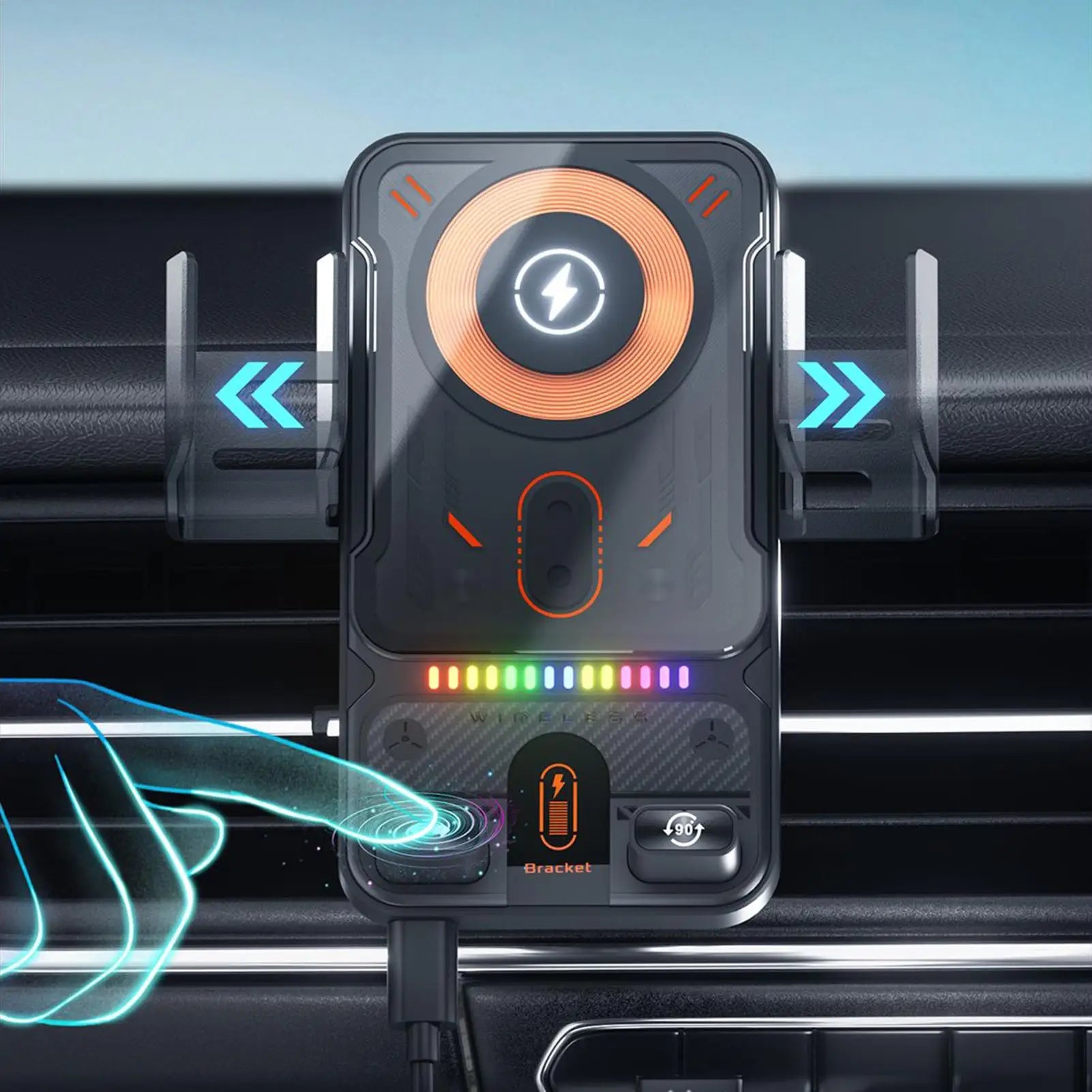 Car Air Vent Electric Rotating Opening Closing Phone Holder Fast Charging 15W Wireless Charger Dua l Coil RGB Light Smart Phones