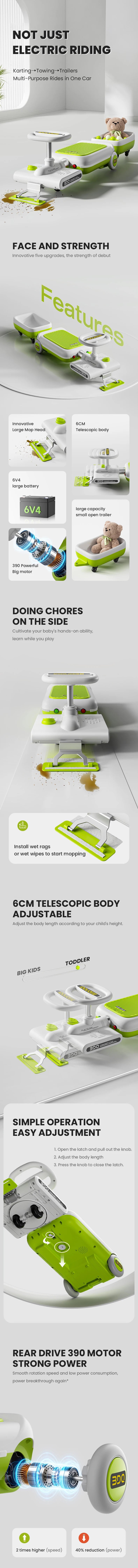 Children Kart with Sweep Tool, Mini Cleaning Toy, Safe Material, Electric Driving 6v4 Battery, Oversized Seat, Over 3 Years Old