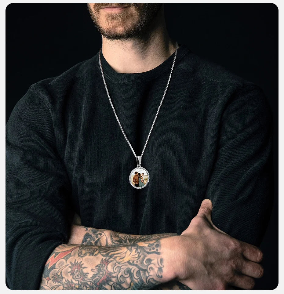 Vnox Free Custom Round Photo Frame Necklaces Gift for Women Men,Big Coin Pendant Zircon Stone Circle,Family Picture Gift to Dad