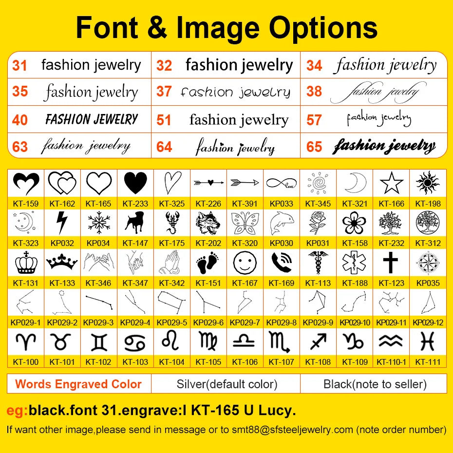eg: Black font 50, engrave : Lucy (165) forever. | |||