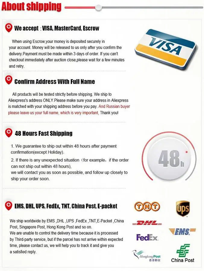 3. All orders will be issued within 3 days, in case of unexpected situation, we may delay the shipping time.